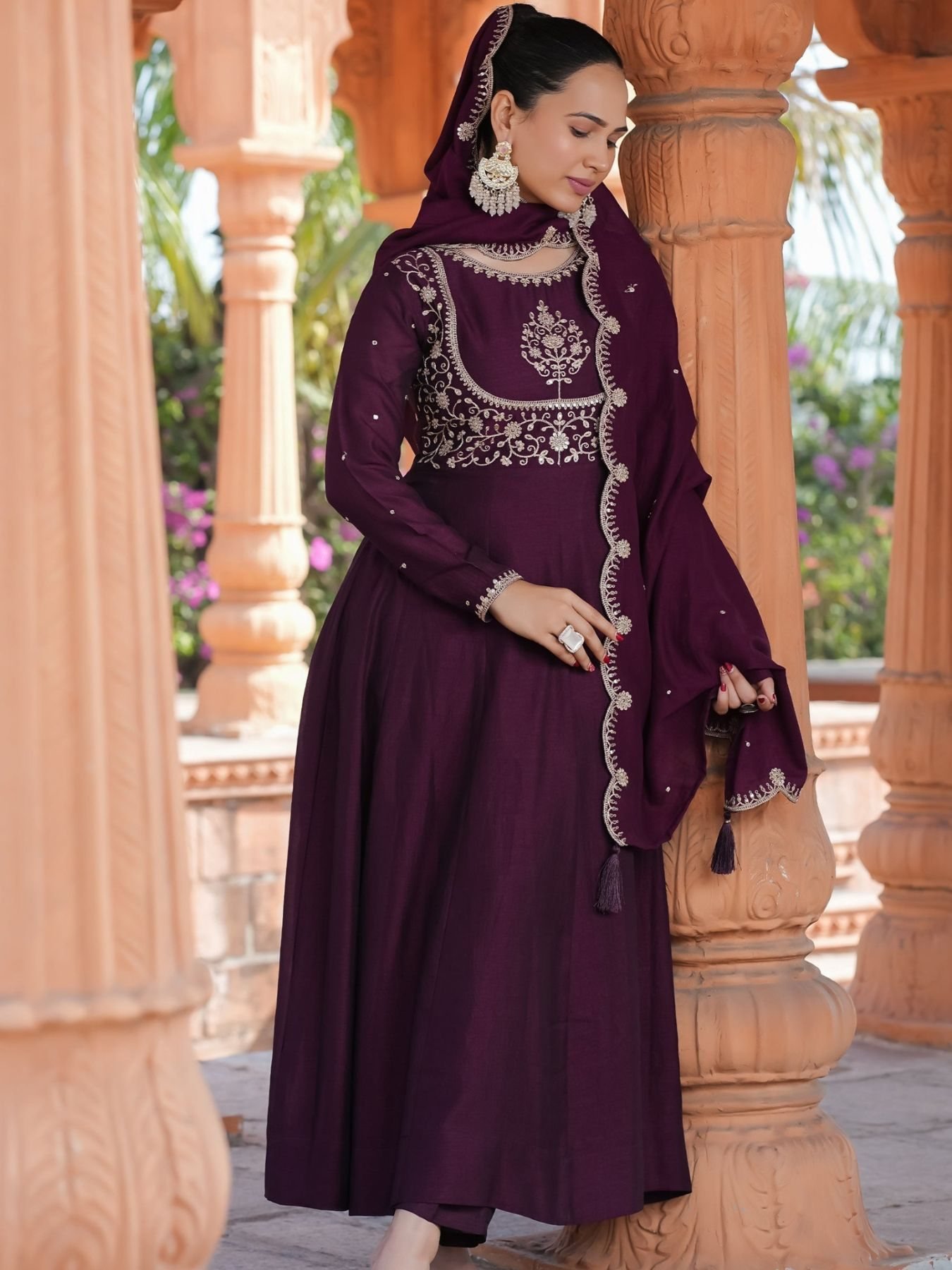 Womens Purple Embellished Anarkali Gown Designer Vichitra Silk Kurti Set with Dupatta Readymade
