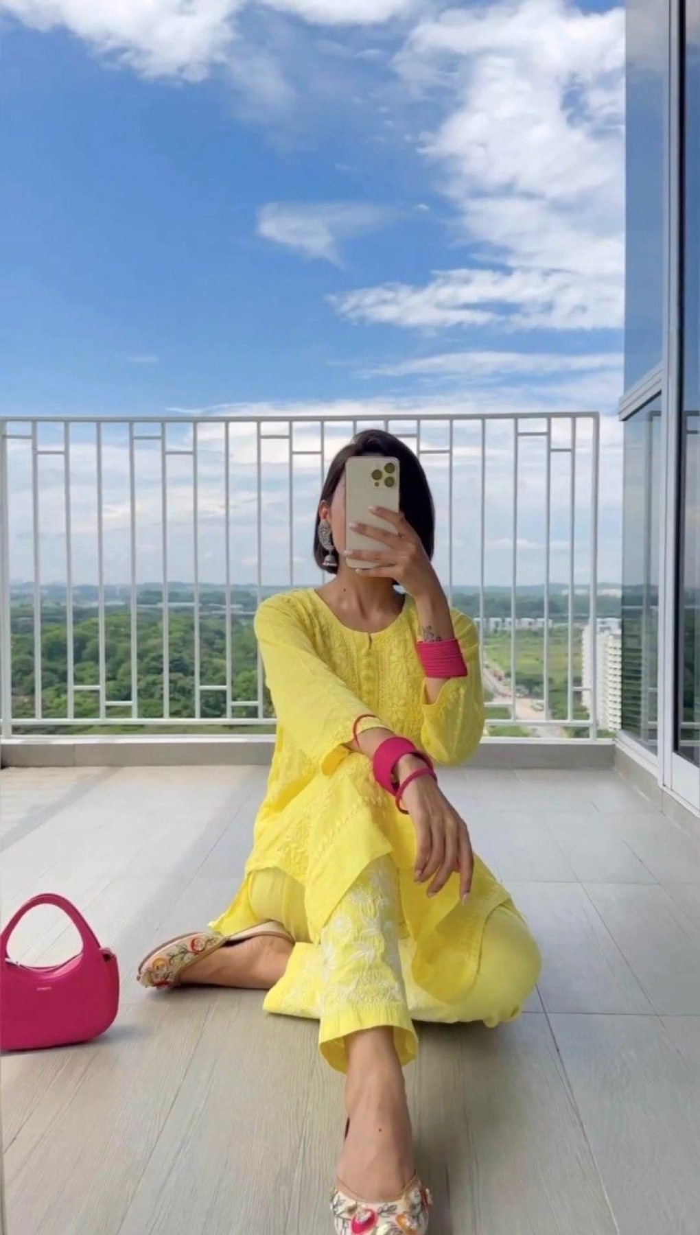 Yellow Chikan Butti Kurti And Pant With Thread Work