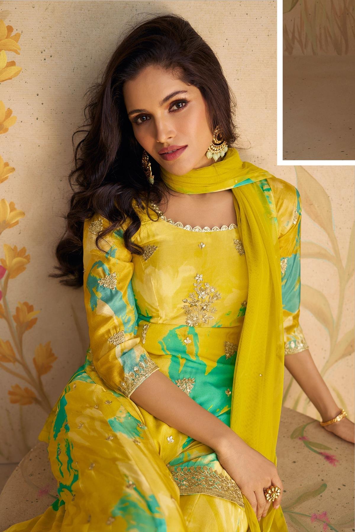 Brighten your festive wardrobe with this Classic Yellow Chinon Silk Palazzo Suit, featuring vibrant multicolor floral digital prints with elegant embroidery work.