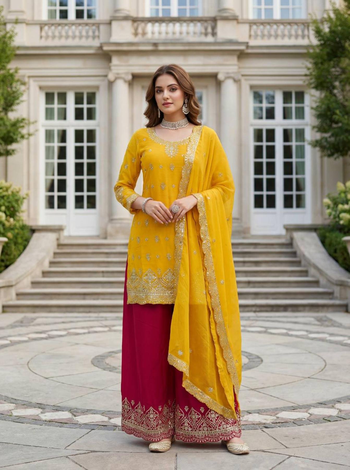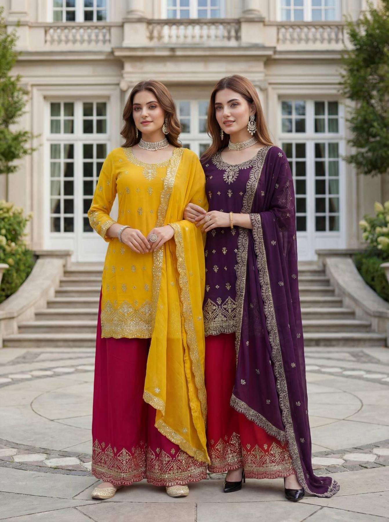Presenting a stylish ready-stitched suit set crafted from premium Chinon Silk, featuring rich sequence and zari embroidery work throughout. Available in yellow and dark purple, this ensemble combines timeless elegance with contemporary design — perfect for parties, festive occasions, and cultural celebrations in Qatar. Offered at competitive wholesale rate and manufacturer rate for bulk buyers and retailers.