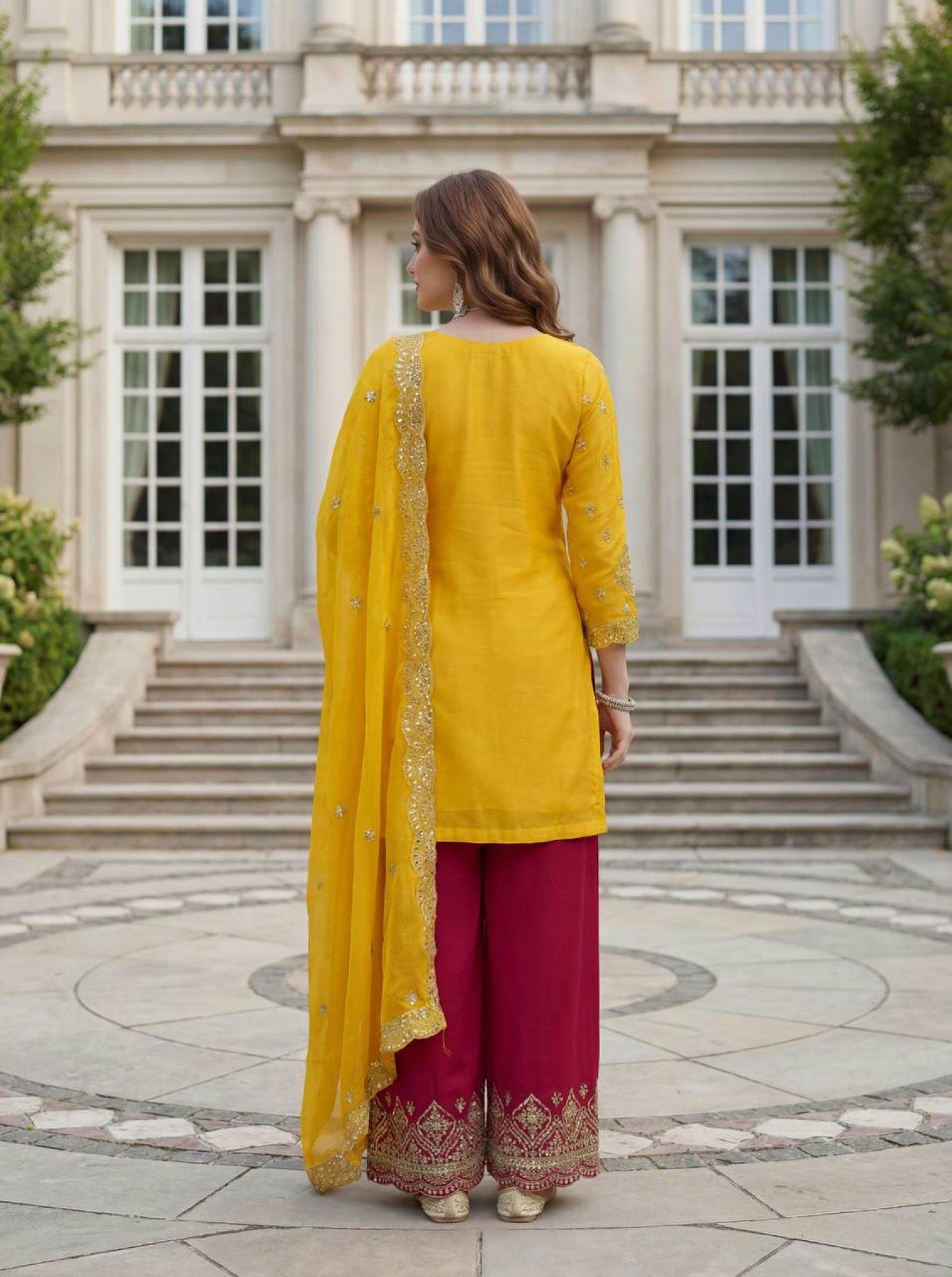 Yellow Chinon Silk Suit Set with Sequence and Zari Work At Best Rates