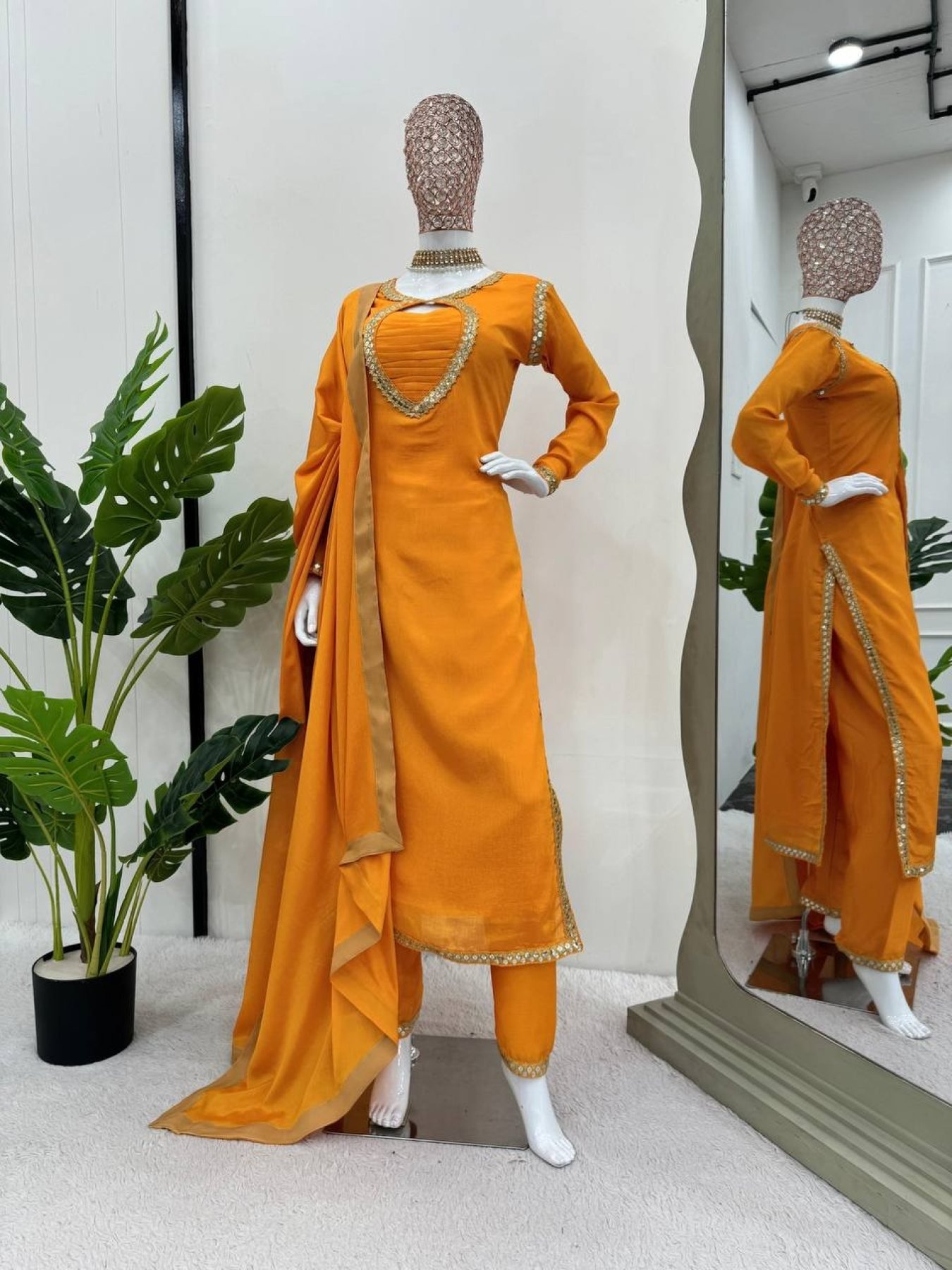 Size ChartElevate your wardrobe with this elegant Yellow Chinon Silk Suit, designed for comfort and style. Featuring intricate thread work with 9mm sequins, this outfit is perfect for festive and party occasions. Fully stitched and ready to wear, it’s available in sizes up to XXL with a margin.