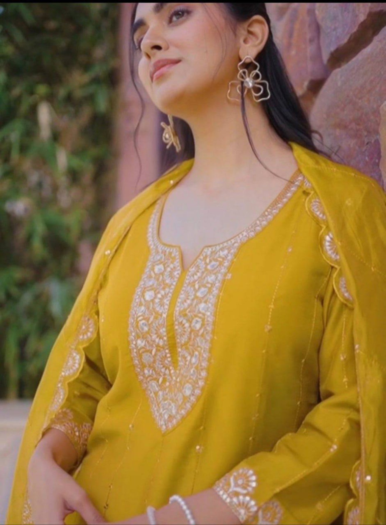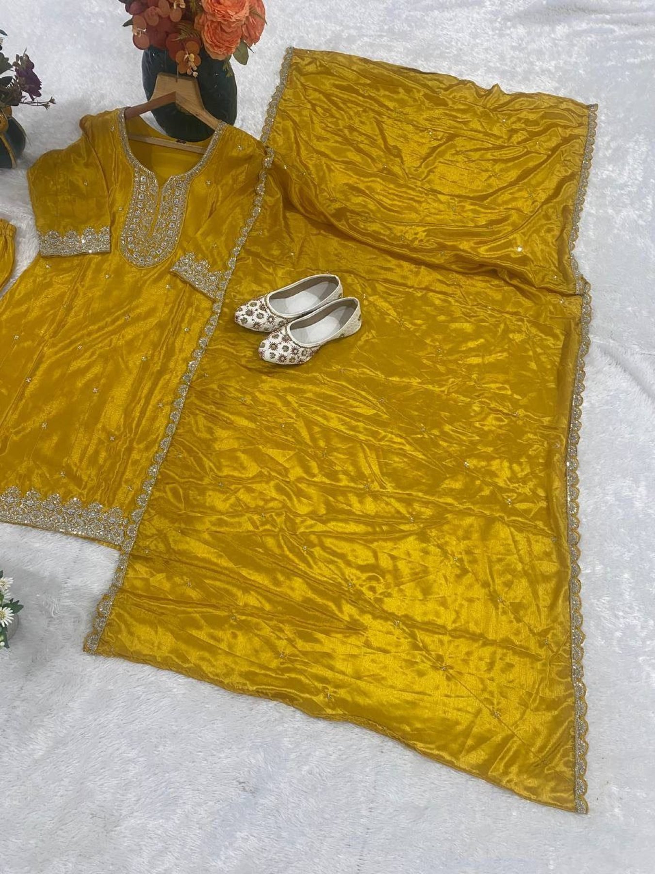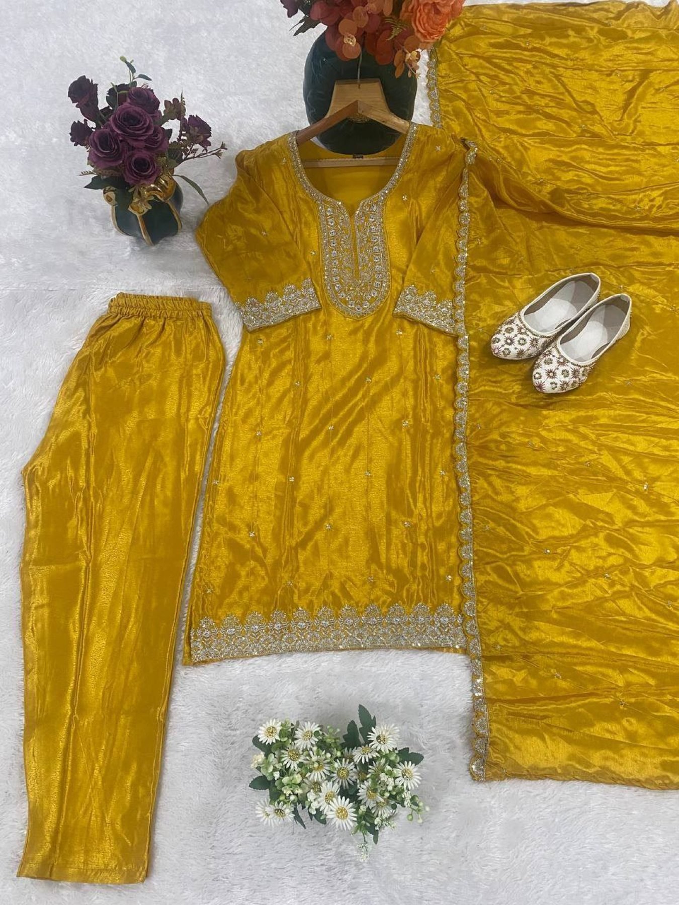 Elegant chinon suit set featuring heavy embroidered kurti with pant and cutwork border dupatta. Perfect for festive and party wear.