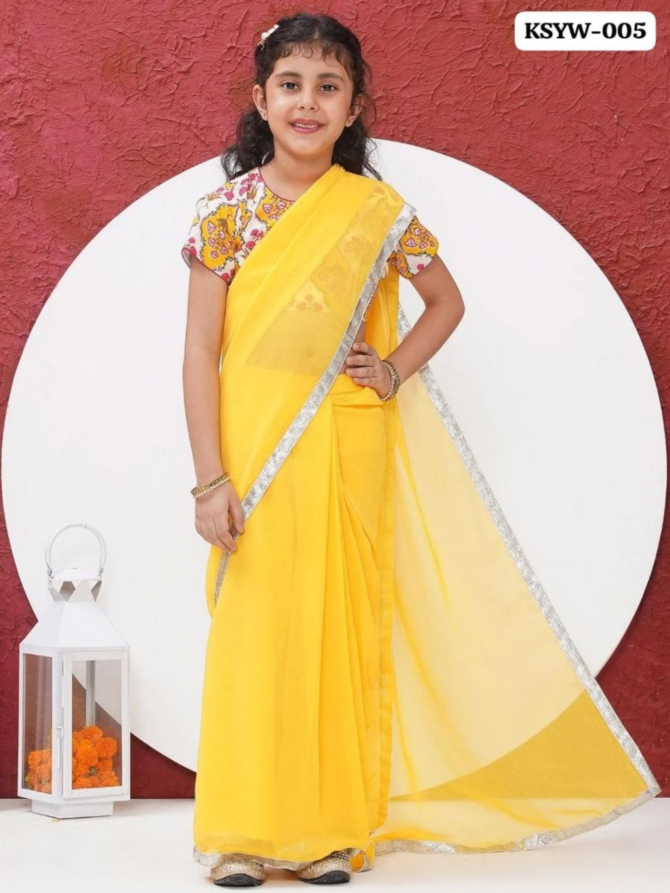 Yellow Georgette Ready To Wear Saree With Silver Lace Border For Baby Girls