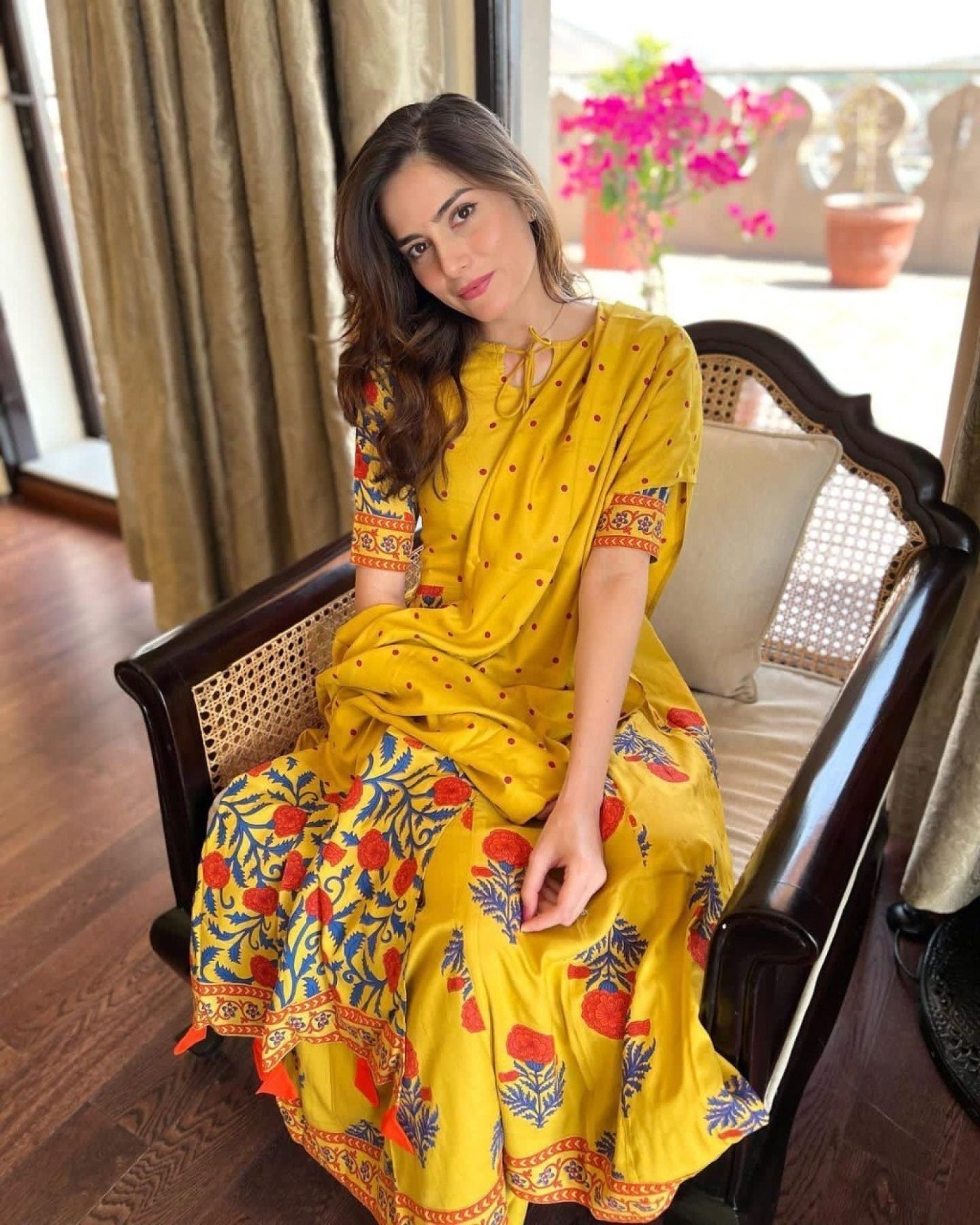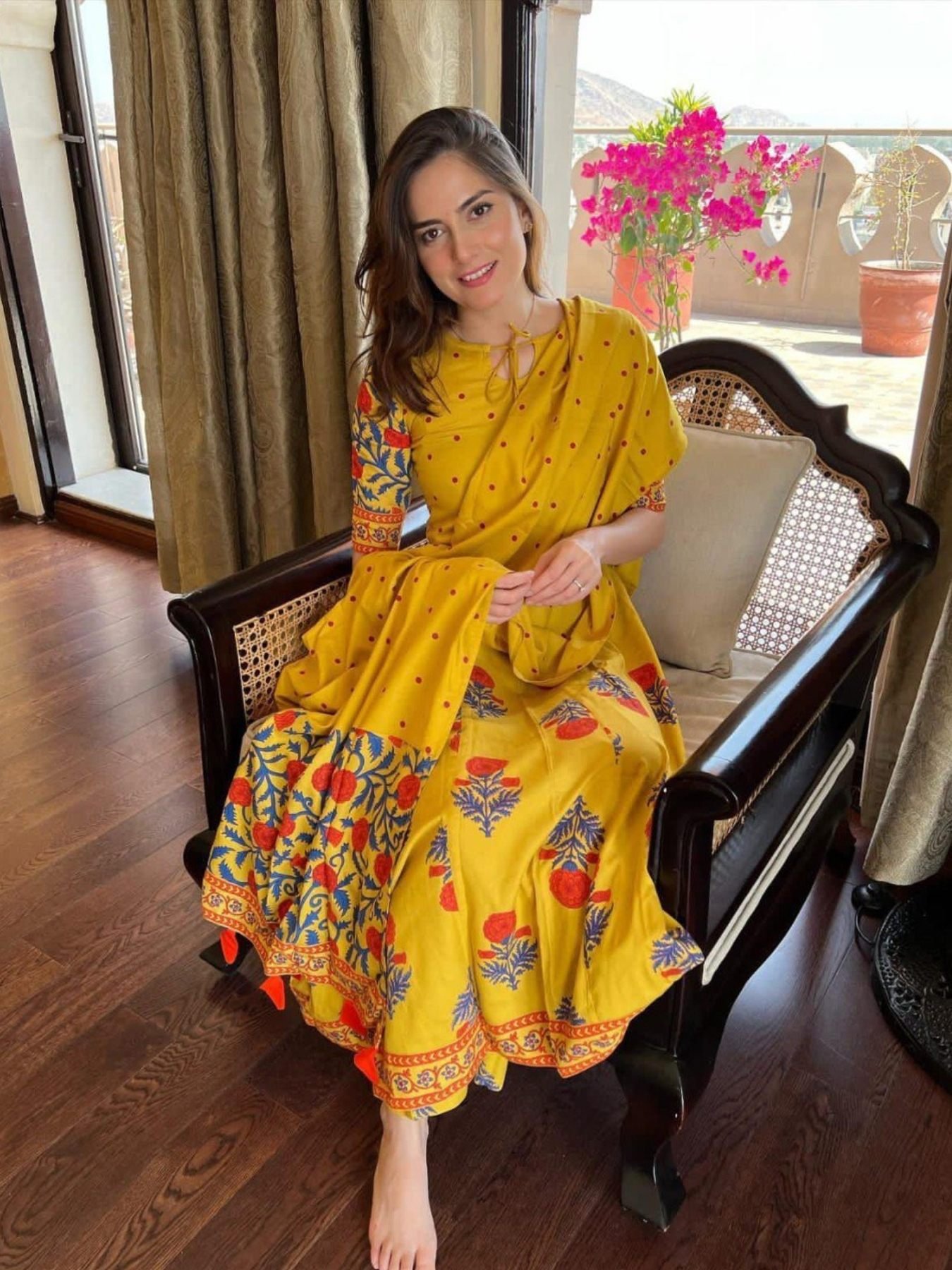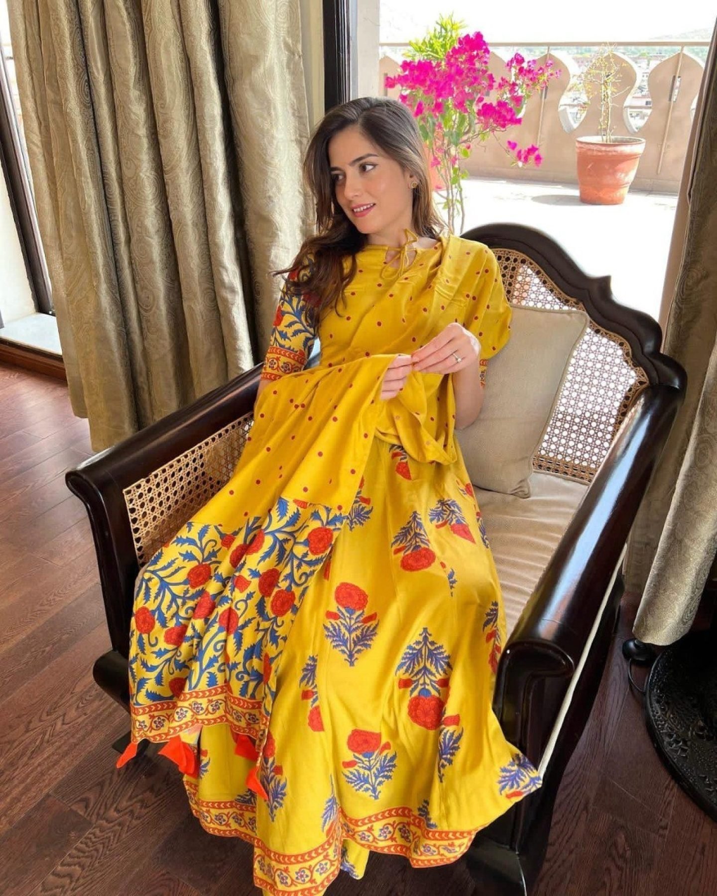 Yellow Muslin Cotton Printed Gown Pant Dupatta