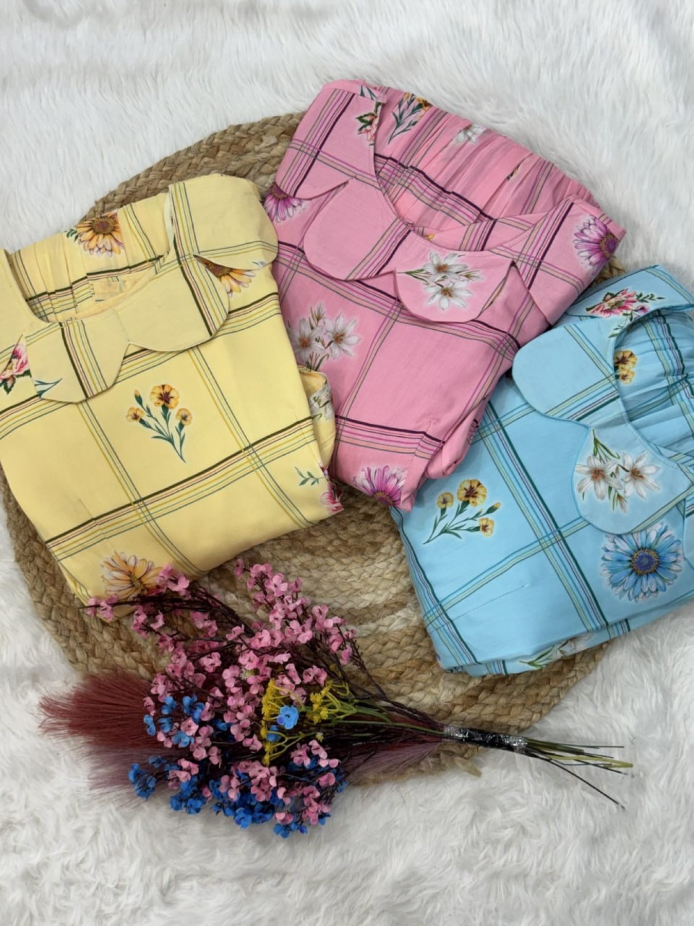 Stylish muslin silk kurti with gingham print, puff sleeves, and 5.5 meter flair. Comfortable and trendy choice for daily and casual wear.