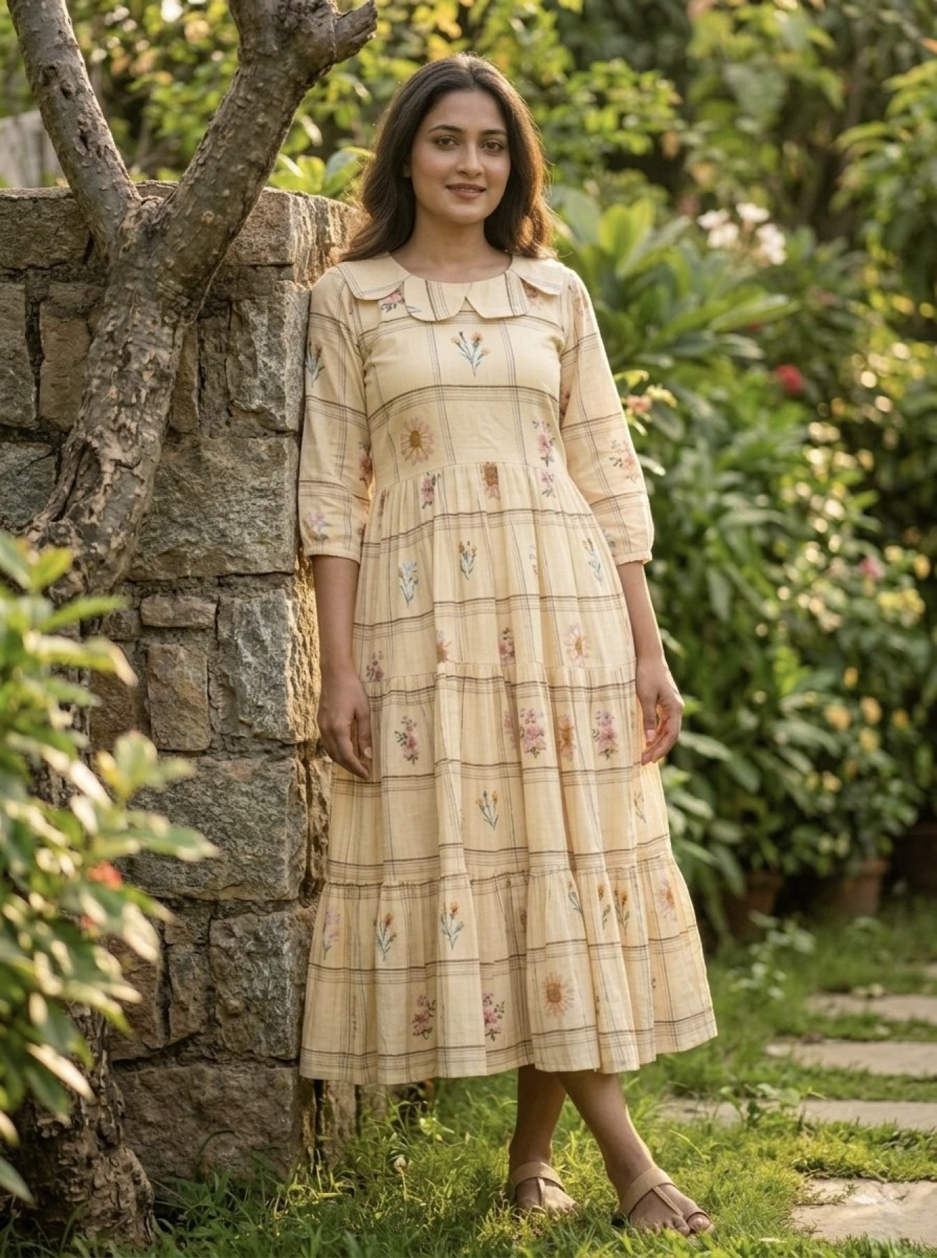 Yellow Muslin Silk Tiered Maxi Dress with Gingham Print and Floral Detail
