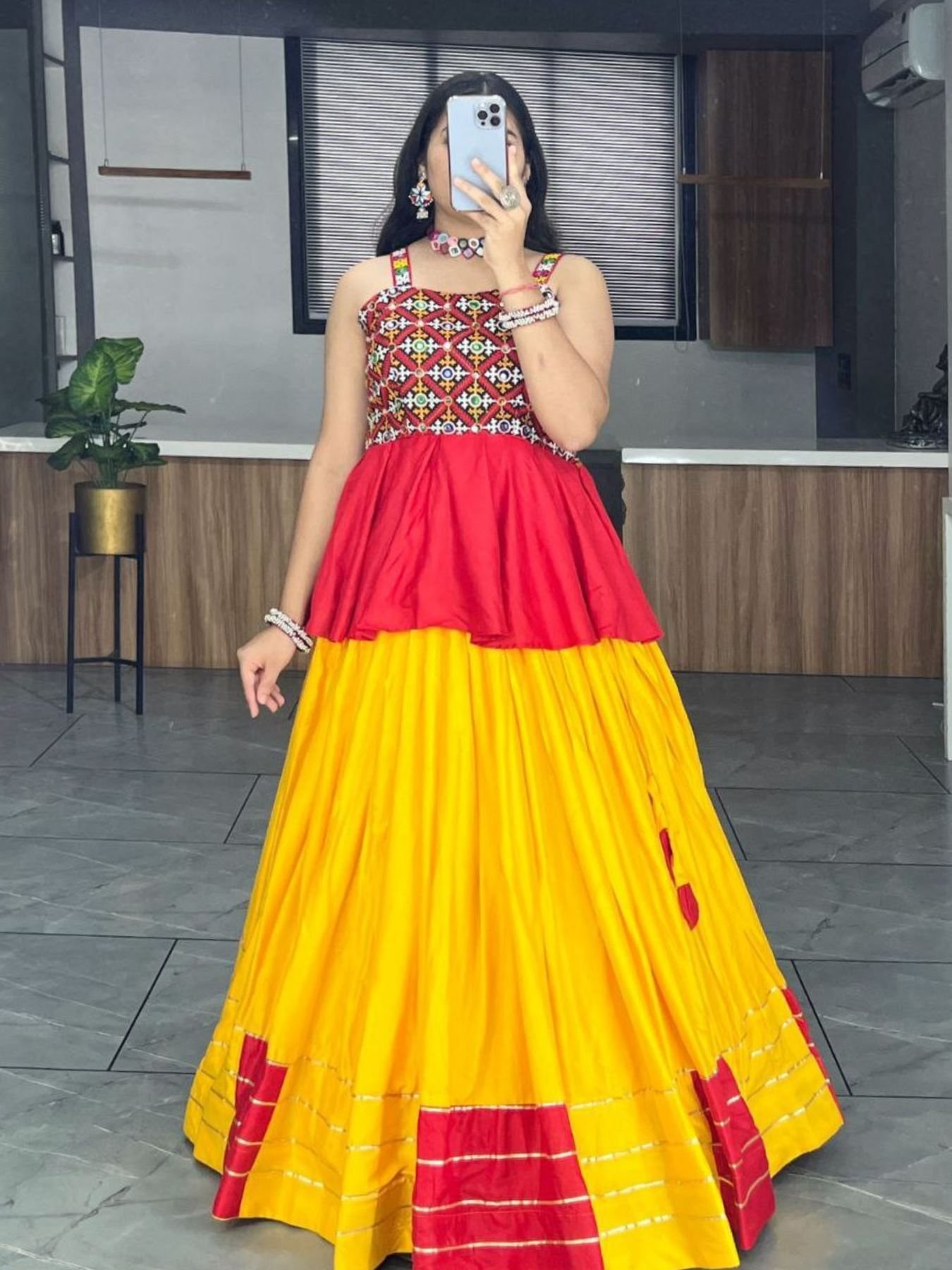 Make this festive season extra special with our exclusive Navratri 2025 lehenga set featuring a stunning yellow lehenga with red border and a traditional kediya-style top. Crafted in pure rayon cotton, the lehenga is adorned with gota patti patchwork and a 6-meter flair for graceful twirls. The kediya top is beautifully designed with gamthi print and mirror work, making it a perfect outfit for garba nights and dandiya celebrations. Fully stitched and comfortable, this set blends tradition with elegance.